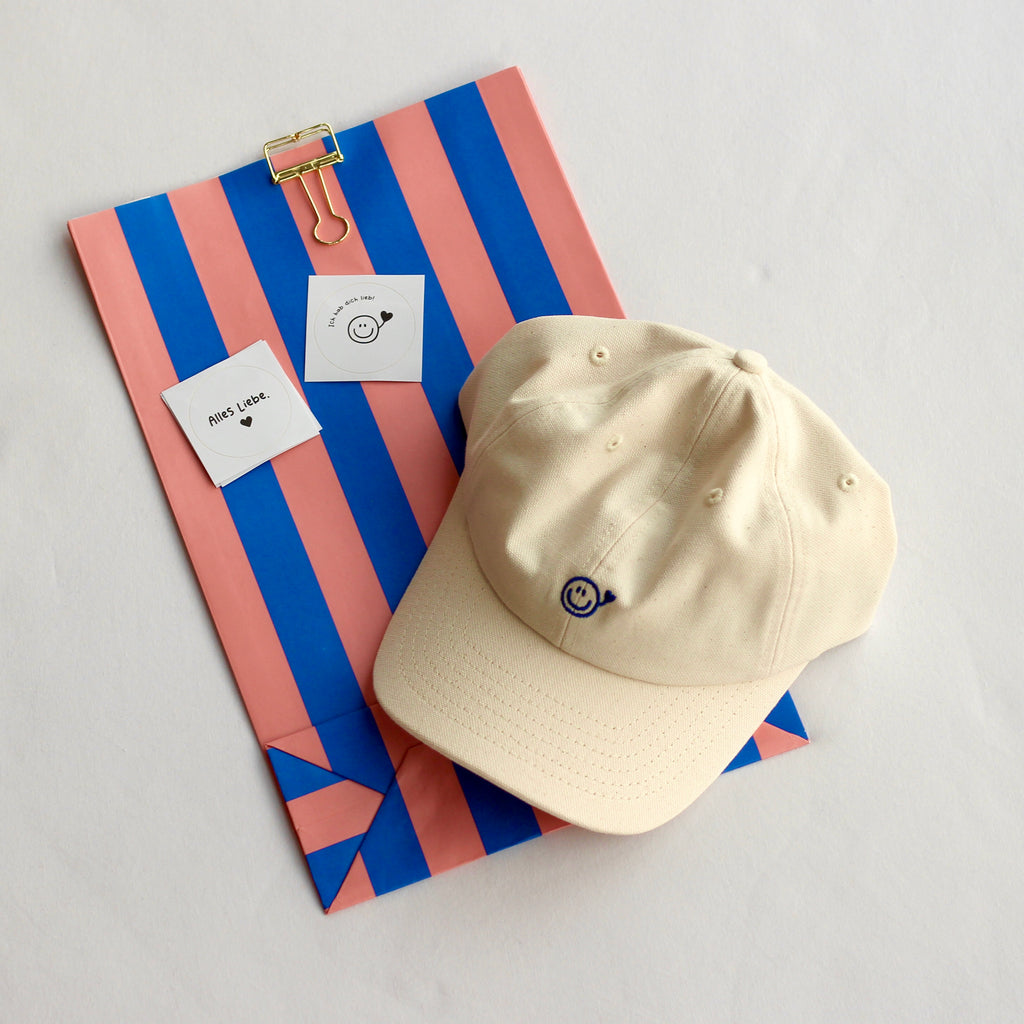 Nachhaltige Fair Fashion Cap, mit der Du ein Statement trägst. Die Caps werden bei 12 Dozen in Bulgarien in Europa hergestellt und aus Bio-Baumwollstoff gefertigt. Der Smiley, der ein Herz in der Hand hält auf der Vorderteite und der Schriftzug "halte an der Liebe fest" an der Rundung des Verschlusses auf der Rückseite sollen dich daran erinnern an der Liebe und dem Guten festzuhalten. Mehr dazu kannst du in unserem Blogartikel lesen.